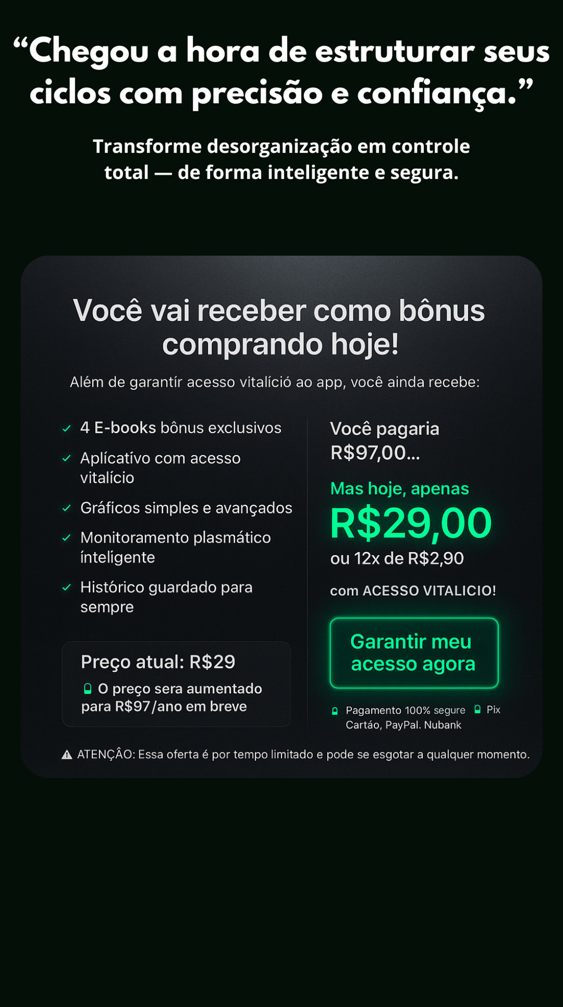 Você não está comprando apenas um app — está garantindo uma plataforma completa para estruturar, acompanhar e evoluir seus ciclos de forma inteligente.”